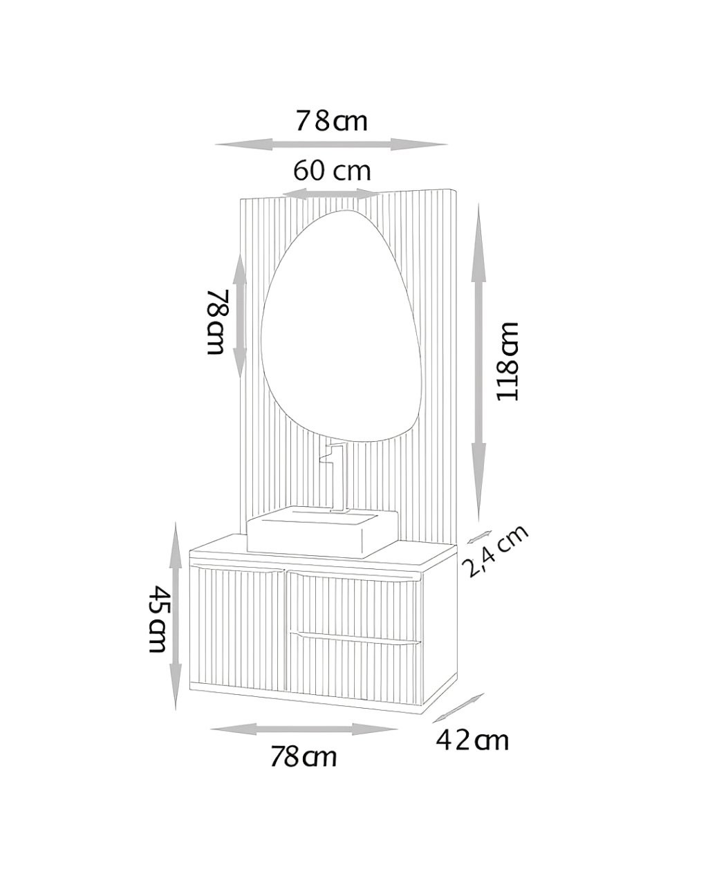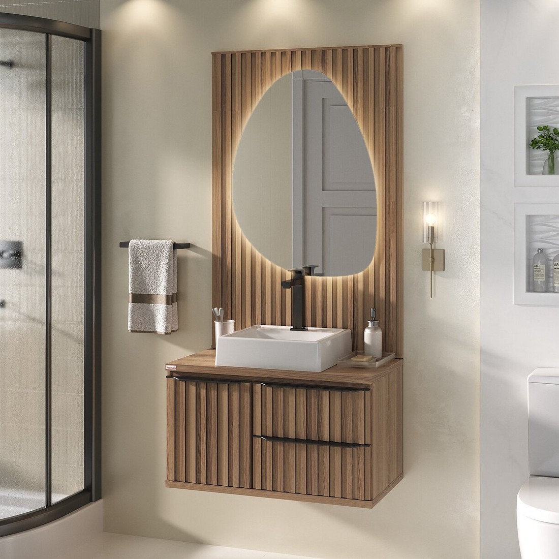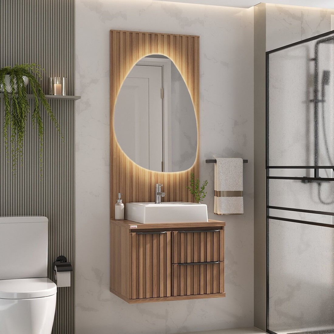 O gabinete possui duas gavetas com abertura total, deslize suave e uma porta com amortecimento, garantindo um fechamento silencioso e elegante. O conjunto fica completo com o painel ripado e o espelho orgânico com LED, que proporciona iluminação sofisticada e torna o banheiro muito mais aconchegante.