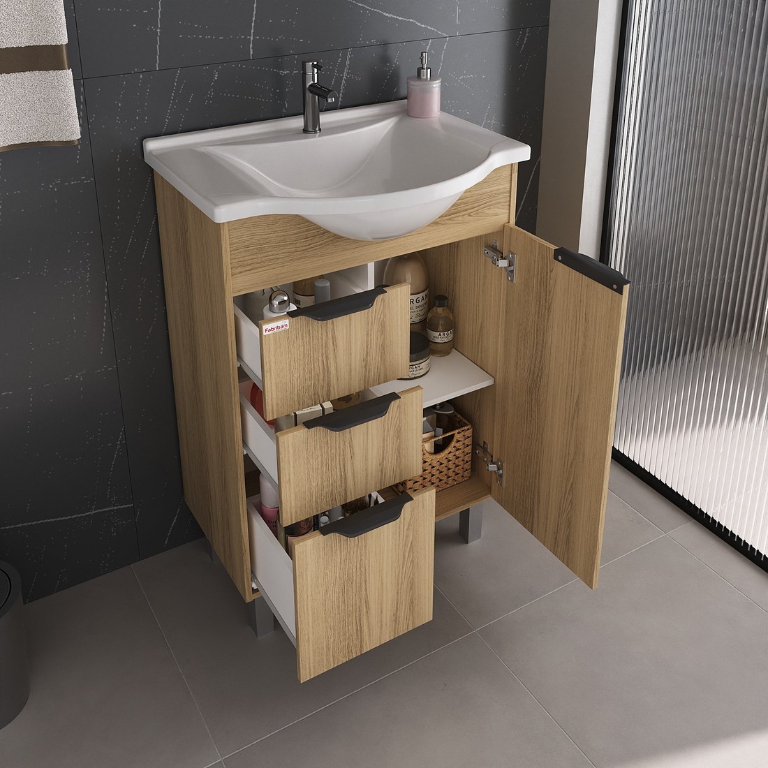 AdicionarO Conjunto Crystal da Fabribam é a solução completa para seu banheiro, combinando elegância e funcionalidade. Com design moderno em tom carvalho, este conjunto inclui um gabinete com três gavetas espaçosas e uma porta, ideal para organizar seus itens de higiene. A espelheira com porta e prateleiras internas, além do espelho amplo, agrega estilo e praticidade. O lavatório em mármore sintético com formato curvo completa o conjunto, trazendo um visual leve e harmonioso. Sua estrutura durável com pés resistentes à umidade e montagem pré-montada tornam este conjunto perfeito para otimizar o espaço e transformar seu banheiro em um ambiente sofisticado e organizado.