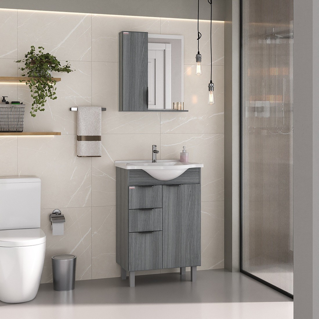 Design Elegante: Puxadores em preto fosco e pés em poliestireno cinza que elevam o visual do seu banheiro.