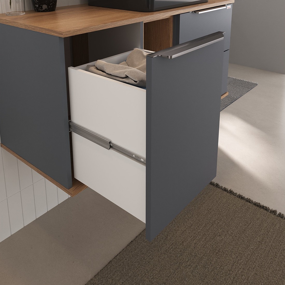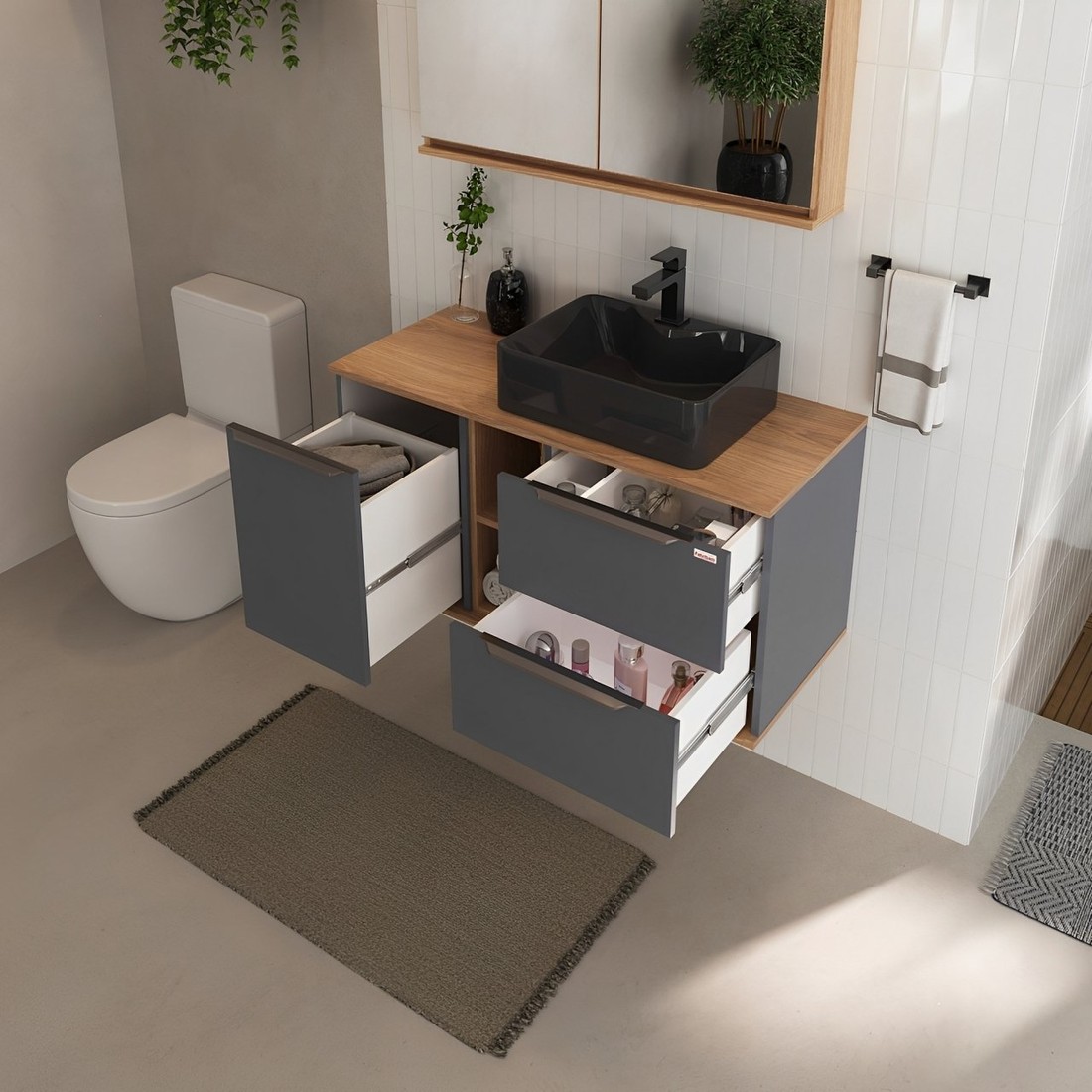 AdicionarO Conjunto Gabriela Suspenso da Fabribam é a escolha perfeita para quem busca sofisticação e funcionalidade. Com 1 metro de largura, este conjunto oferece amplo espaço interno e conta com uma tulha deslizante, ideal para organizar o banheiro. As cores Chumbo e Catedral se combinam harmoniosamente, adicionando um toque de elegância ao ambiente. As gavetas com corrediças telescópicas proporcionam acesso total, enquanto a espelheira de 89 cm, a maior da categoria, e a cuba Stella preta, feita de mármore sintético, garantem praticidade e estilo. O gabinete suspenso facilita a limpeza, e a pintura UV resistente a umidade e produtos químicos assegura a durabilidade do produto.